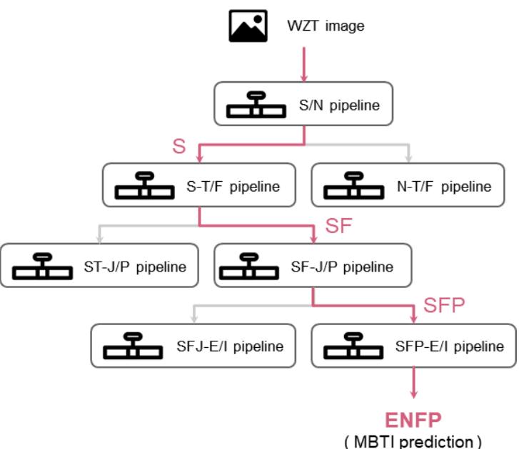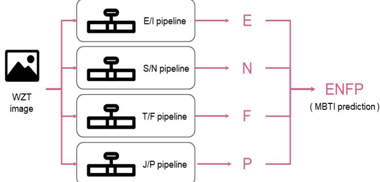 We generated four binary classification prediction models that classify the dataset into E–I, S–N, T– F, and J–P, and measured the accuracy by combining the four prediction values. Reveals that the accuracy increased using binary classification, and the MBTI was predicted for four personality positions and then combined to measure the accuracy. When training four binary classification prediction models, we used the pipeline in Fig. 2 to select the model influencing learning.