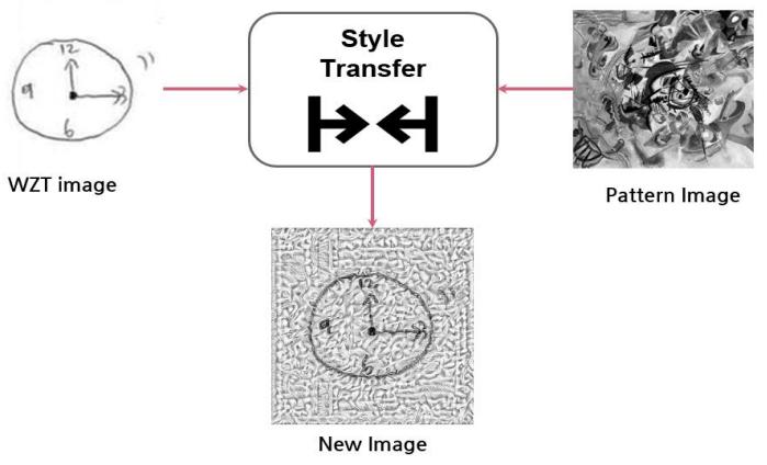 A common characteristic of the WZT drawing created by students is the many blank spaces in the picture, which makes it is difficult to determine characteristics from the picture. In this research, we apply style transfer, one of the GAN methodologies, to compensate for this. The image from the WZT created by the students was not deformed, and the pattern was revealed by combining noise using the GAN in the margin [38].