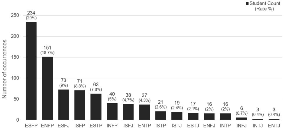 Fig. 5. Distribution and frequency of MBTI personality types for 808 people.