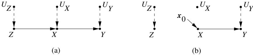 Figure 2: (a) The diagram associated with the structural model of Eq. (5). (b) The diagram associated with the modified model of Eq. (6), representing the intervention do(X = x0).