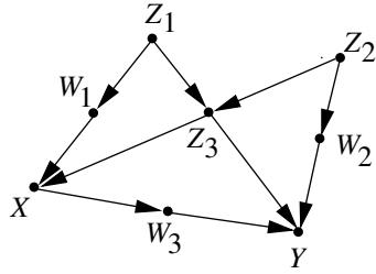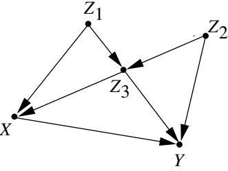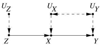 To illustrate, the path UZ → Z → X → Y is blocked by S = {Z} and by S = {X}, since each emits an arrow along that path. Consequently we can infer that the conditional independencies UZ⊥⊥Y|Z and UZ⊥⊥Y|X will be satisfied in any probability function that this model can generate, regardless of how we parametrize the arrows. Likewise, the path UZ → Z → X ← UX is blocked by the null set {/0} but is not blocked by S = {Y}, since Y is a descendant of the collision node X.