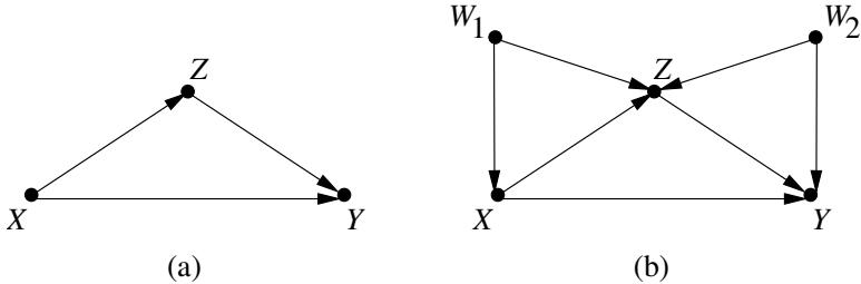 Although each causal assumption in isolation cannot be tested, the sum total of all causal assumptions in a model often has testable implications. The chain model of Fig. 2(a), for example, encodes seven causal assumptions, each corresponding to a missing arrow or a missing double-arrow between a pair of variables. None of those assumptions is testable in isolation, yet the totality of all those assumptions implies that Z is unassociated with Y in every stratum of X. Such testable implications can be read off the diagrams using a graphical criterion known as dseparation (Pearl, 1988).