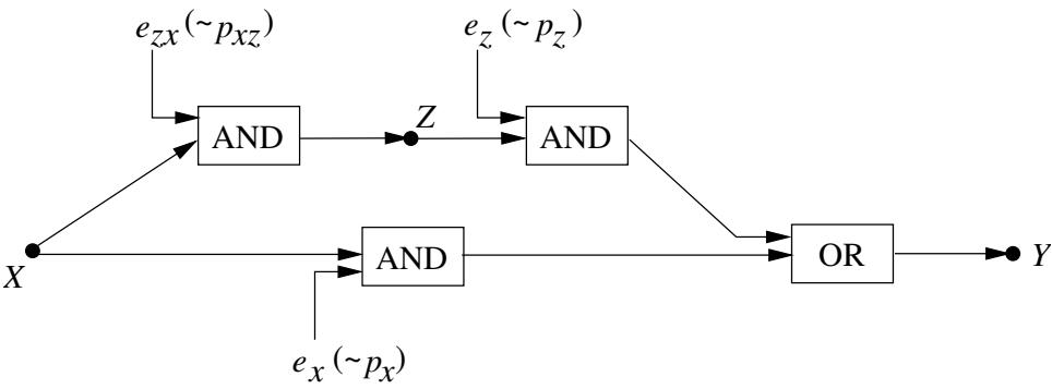 \[\begin{array}{rcl} z & = & f\text{z}(\mu\_{\mathbb{Z}}) \\ x & = & f\text{x}(z, \mu\_{\mathbb{X}}) \\ y & = & f\text{y}(\text{x}, \mu\_{\mathbb{Y}}) \end{array} \tag{5}\]
