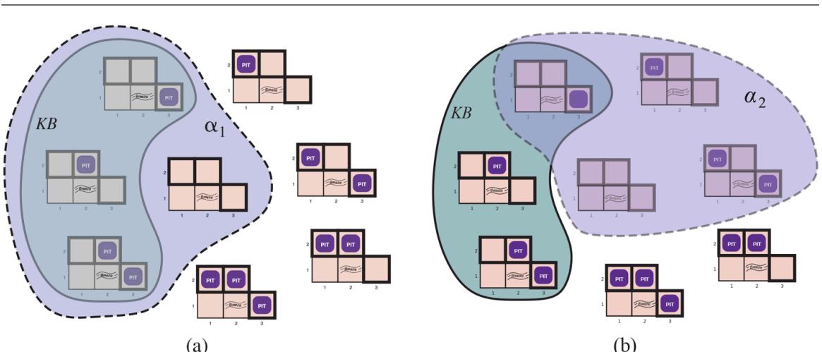 Two later stages in the progress of the agent. (a) After moving to [1,1] and then [1,2], and perceiving [Stench,None,None,None,None]. (b) After moving to [2,2] and then [2,3], and perceiving [Stench,Breeze,Glitter,None,None].