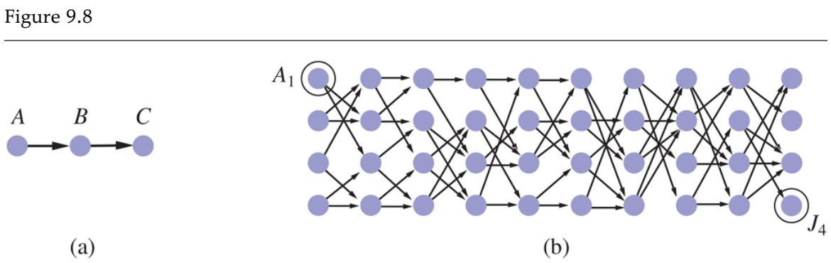 We begin by considering just the temporal scheduling problem, ignoring resource constraints. To minimize makespan (plan duration), we must find the earliest start times for all the actions consistent with the ordering constraints supplied with the problem. It is helpful to view these ordering constraints as a directed graph relating the actions, as shown in Figure 11.14 . We can apply the critical path method (CPM) to this graph to determine the possible start and end times of each action. A path through a graph representing a partial-order plan is a linearly ordered sequence of actions beginning with Start and ending with Finish. (For example, there are two paths in the partial-order plan in Figure 11.14 .)