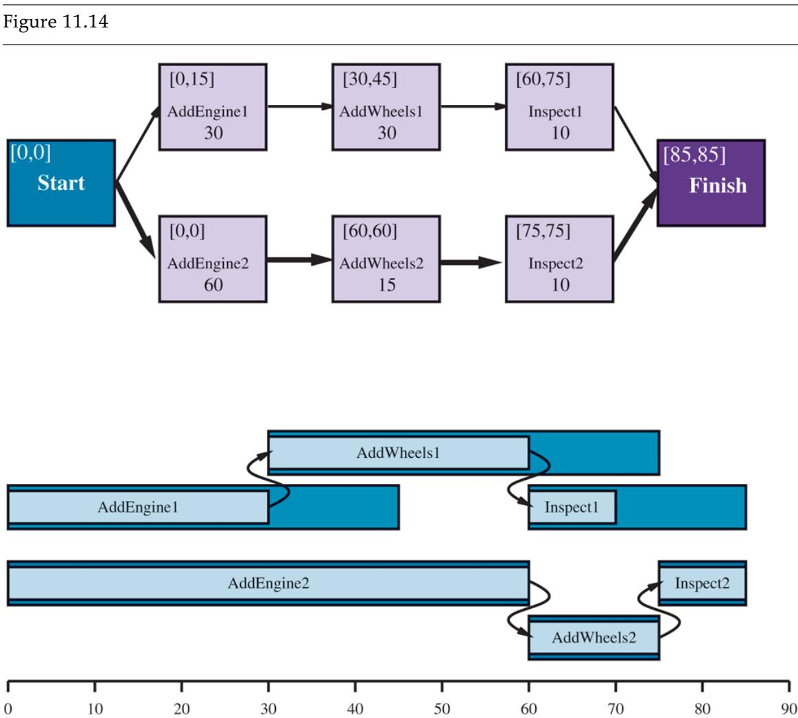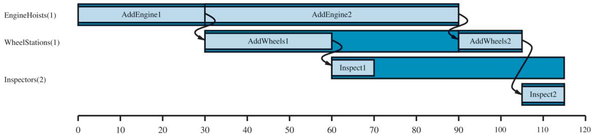 Figure 11.15 shows the solution with the fastest completion time, 115 minutes. This is 30 minutes longer than the 85 minutes required for a schedule without resource constraints. Notice that there is no time at which both inspectors are required, so we can immediately move one of our two inspectors to a more productive position.