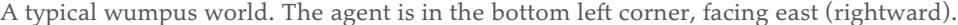 used to pick up the gold if it is in the same square as the agent. The action Shoot can be used to fire an arrow in a straight line in the direction the agent is facing. The arrow continues until it either hits (and hence kills) the wumpus or hits a wall. The agent has only one arrow, so only the first Shoot action has any effect. Finally, the action Climb can be used to climb out of the cave, but only from square [1,1].