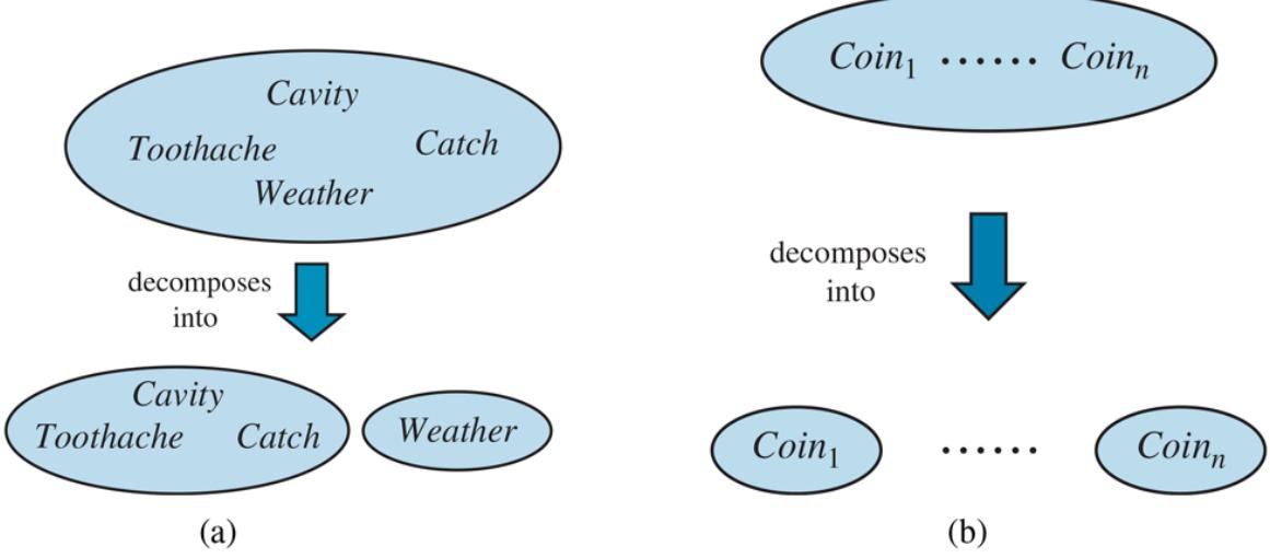 It is important to understand that is still valid after is observed; it just isn’t especially useful. When making decisions, an agent needs to condition on all the evidence it has observed. It is also important to understand the difference between conditioning and logical implication. The assertion that does not mean “Whenever is true, conclude that is true with probability 0.6” rather it means “Whenever is true and we have no further information, conclude that is true with probability 0.6.” The extra condition is important; for example, if we had the further information that the dentist found no cavities, we definitely would not want to conclude that is true with probability 0.6; instead we need to use .