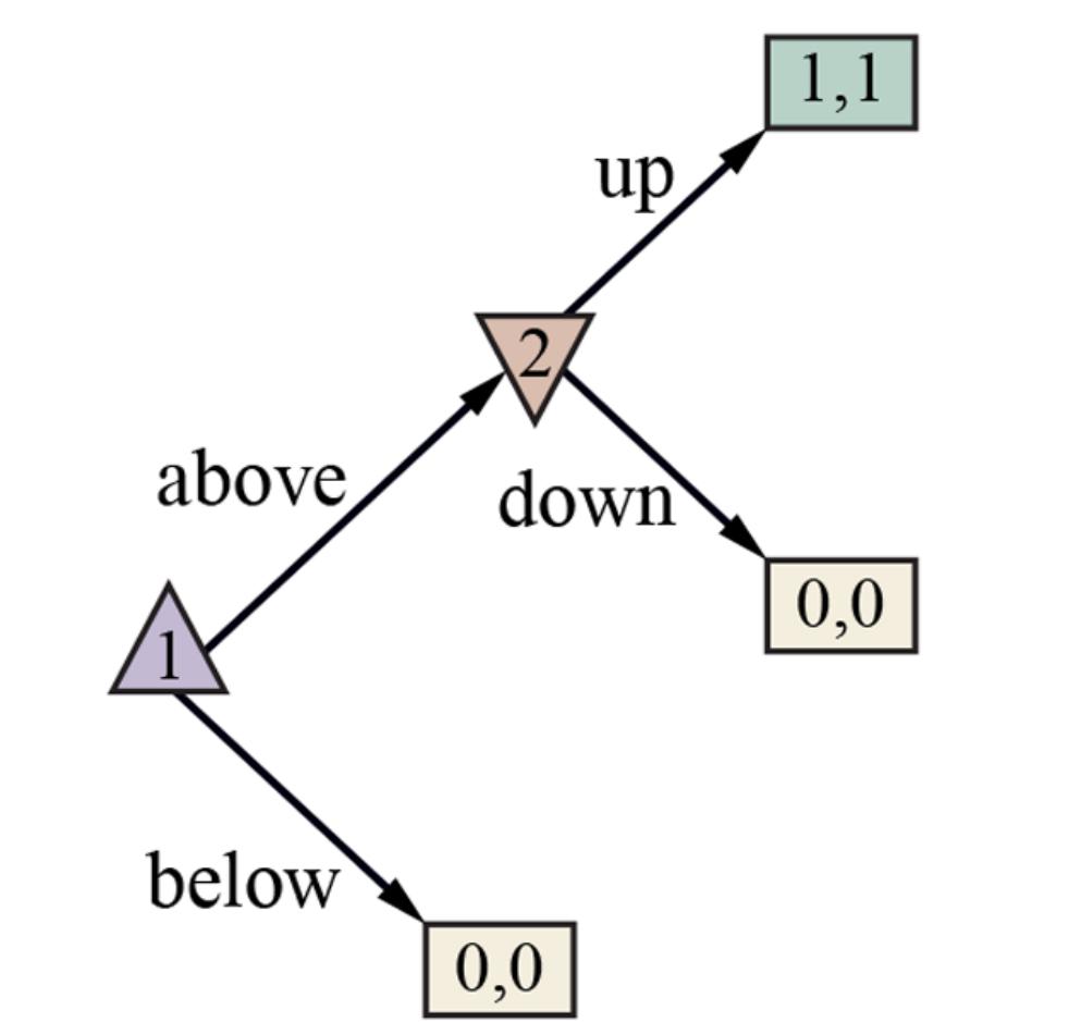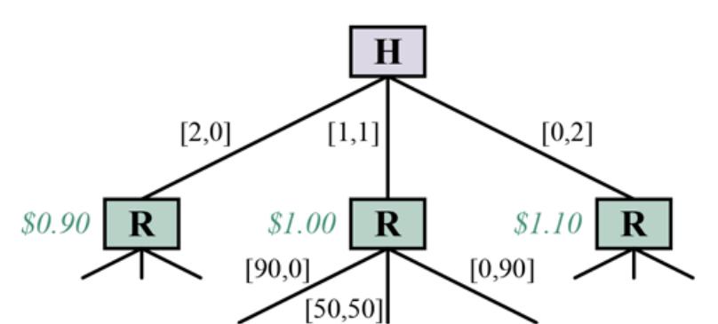 Now consider the case where we permit exactly two rounds of negotiation. Now the power has shifted: can simply reject the first offer, thereby turning the game into a one-round game in which is the first mover and thus will get the whole pie. In general, if the number of rounds is a fixed number, then whoever moves last will get all the pie.
