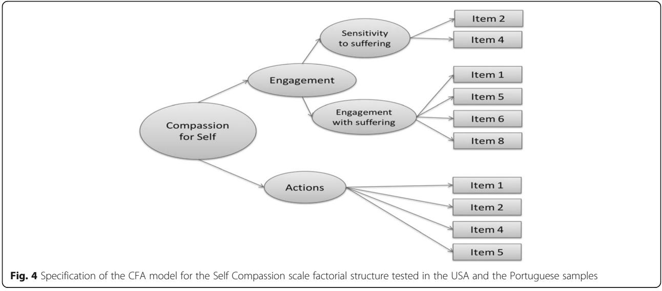 In early versions of this scale UK and Portuguese research colleagues tried to generate a number of items for each competency depicted in figure 1. Those proved to have poor psychometric properties and were too long. Derived from this experience we then chose to use only single questions for each competency. The wording for each question was circulated to the research team and other research colleagues for advice. So for the construction of this measure we have used single questions to tap each of the six Engagement processes associated with the first psychology of engagement and four of the Action processes associated with the second psychology. We will now refer to these separately as engagement and action respectively. We created three versions for each scale: compassion for others, compassion from others, and self-compassion; producing a total of six scales (two for each flow).