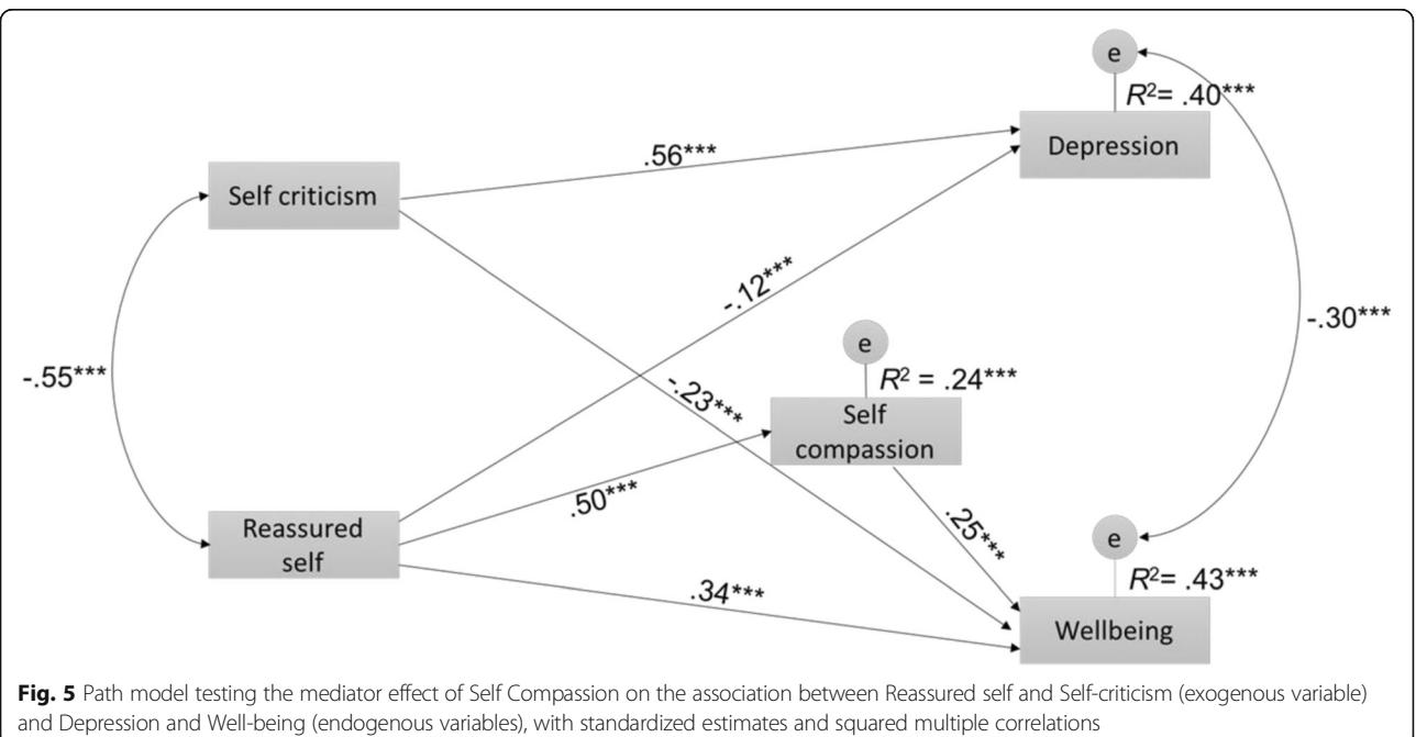 A path-analysis showed that self-compassion is a significant mediator of the association between self-reassurance and well-being, while self-criticism has a direct effect on depressive symptoms, not mediated by self-compassion.