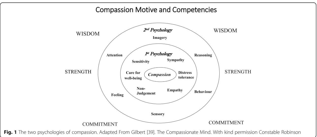 Our approach is focused on exploring the evolved caring motivational processing of compassion and identification of the competencies needed for compassion [36, 41, 45, 85]. Compassion Focused Therapy is a psychotherapy focused approach requiring identification of key competencies and attributes that then become the focus for therapy, intervention and training [40].