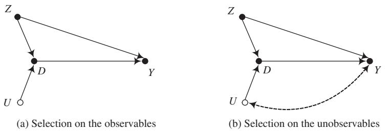 | 8.6 | Two graphs where selection on the unobservables is given an explicit | |