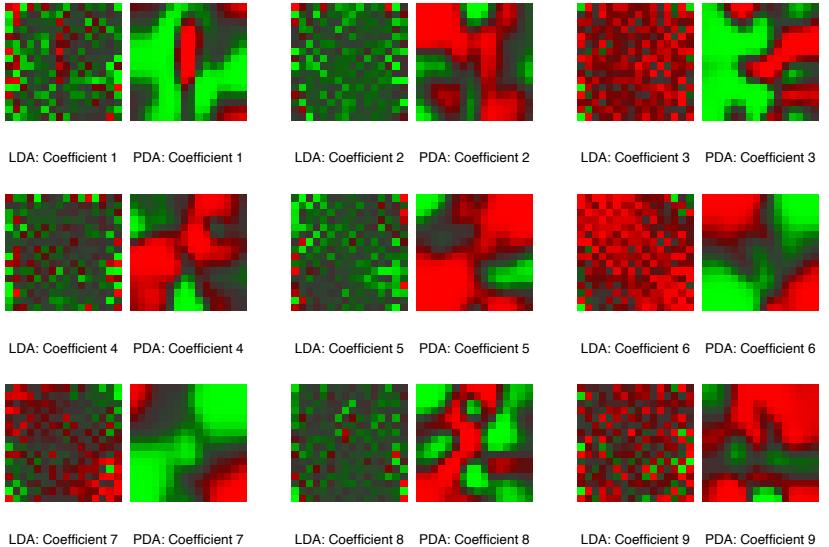 Ex. 18.8 Data Piling. Exercise 4.2 shows that the two-class LDA solution can be obtained by a linear regression of a binary response vector y consisting of −1s and +1s. The prediction βˆT x for any x is (up to a scale and shift) the LDA score δ(x). Suppose now that p ≫ N.