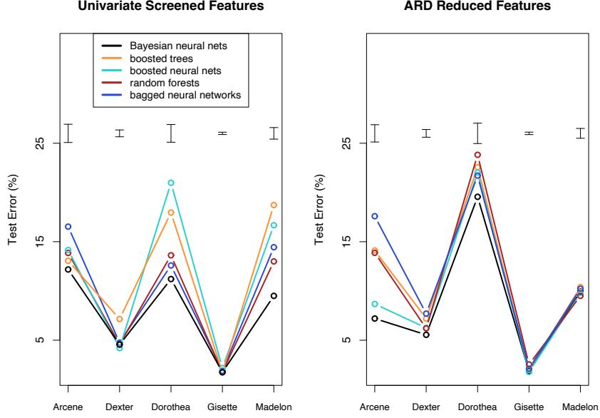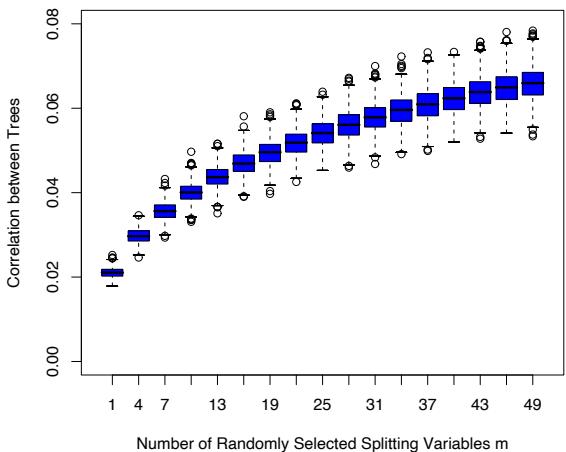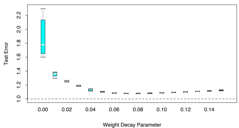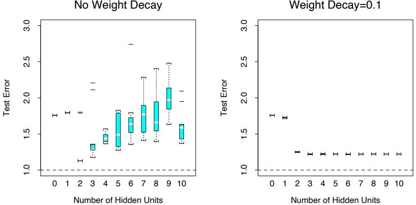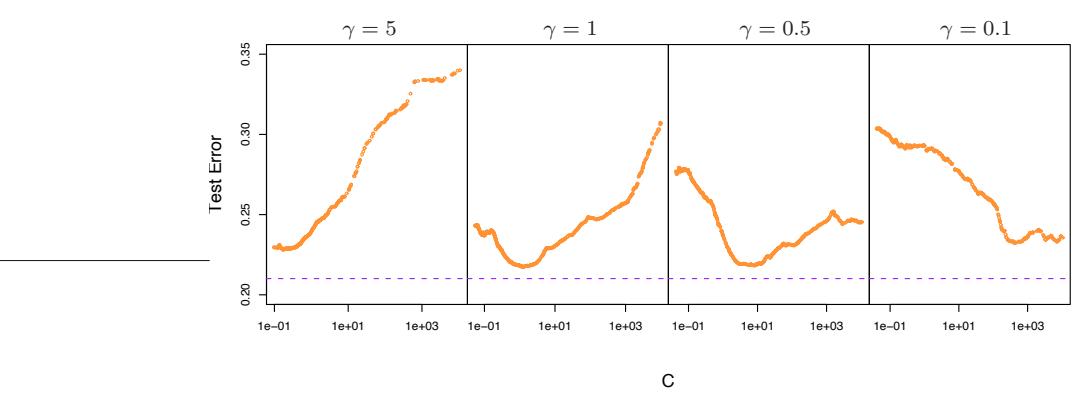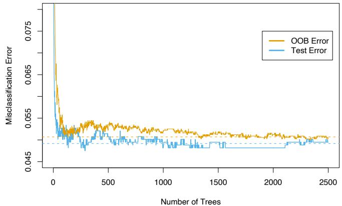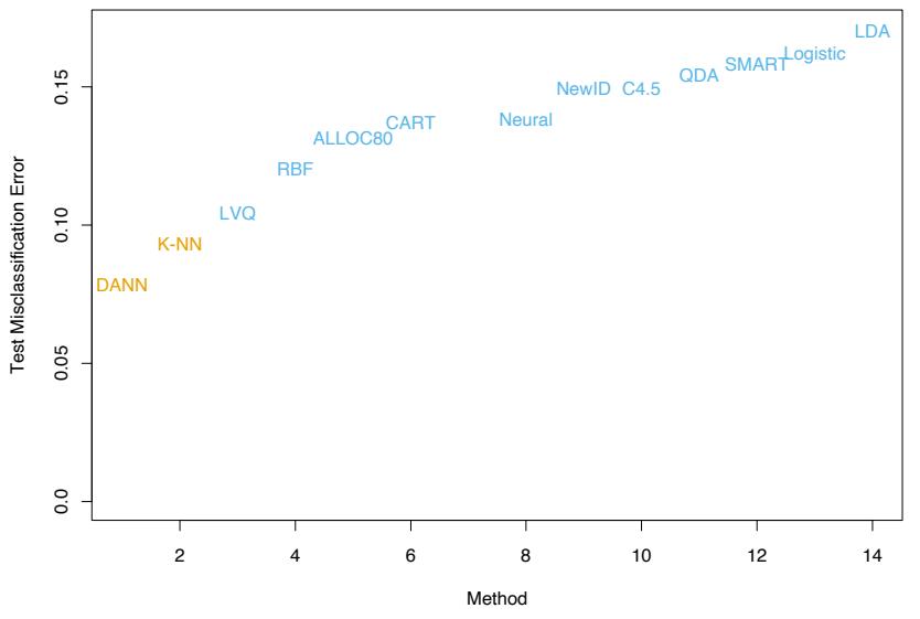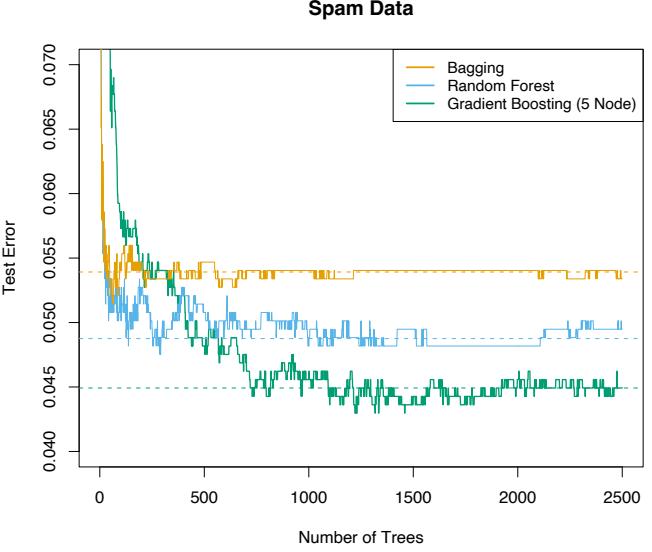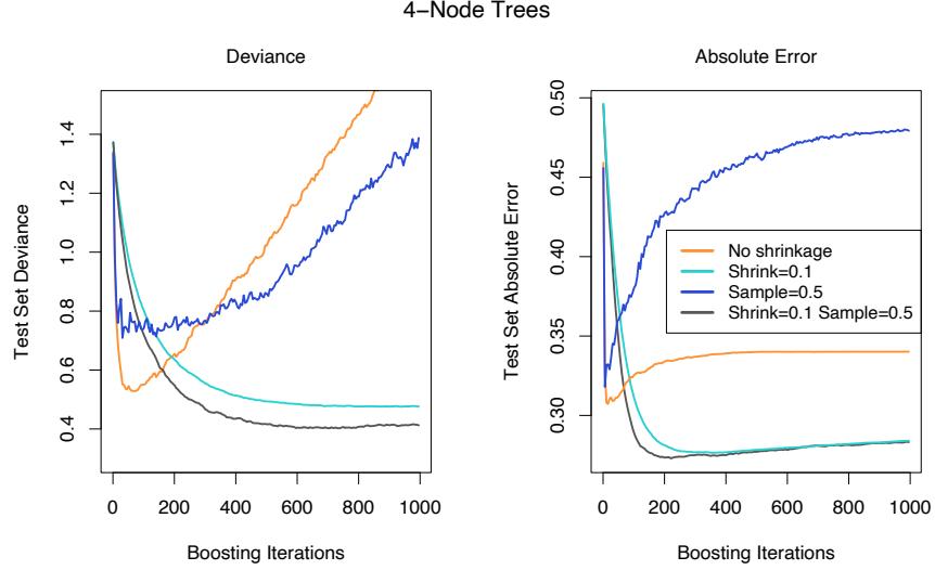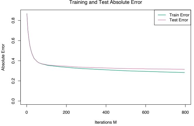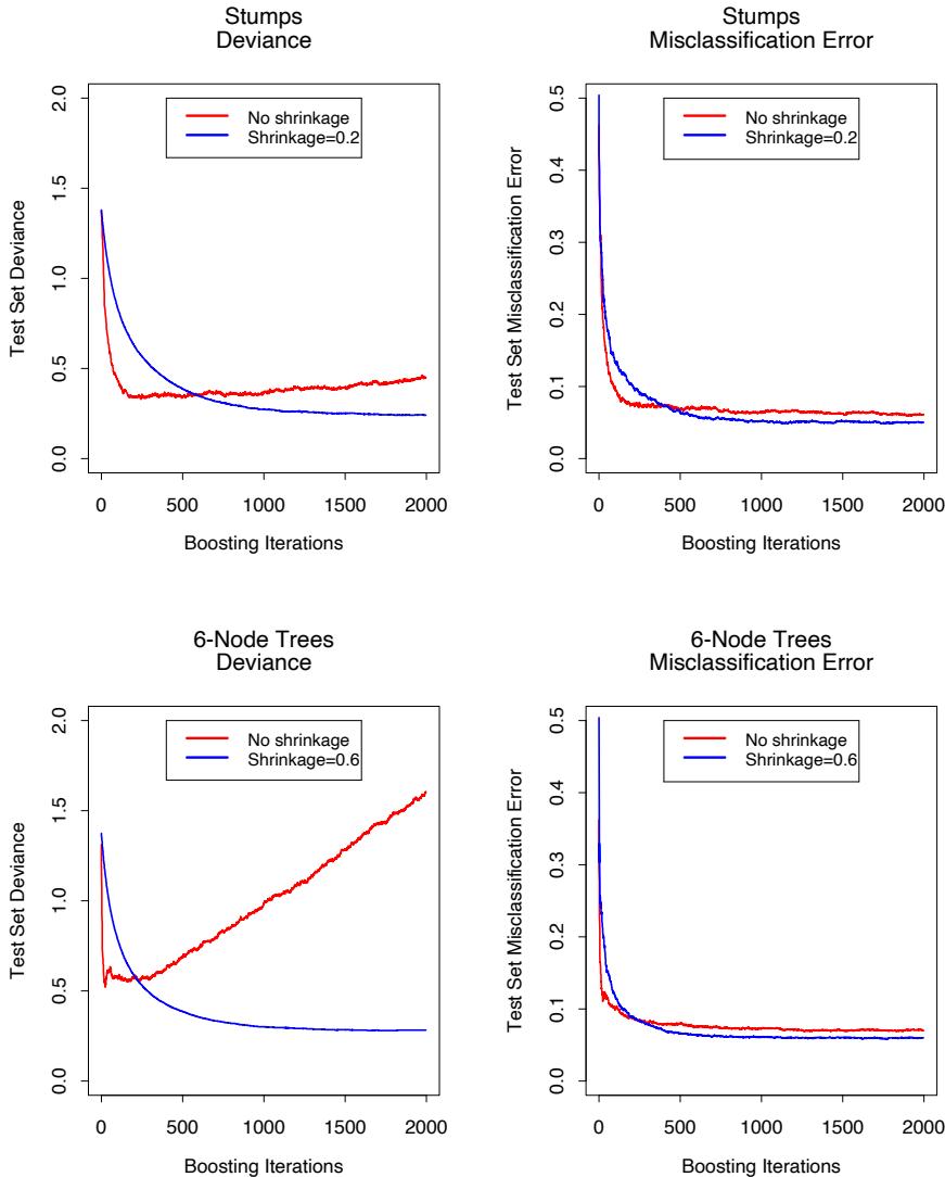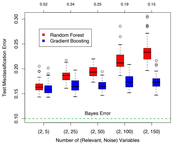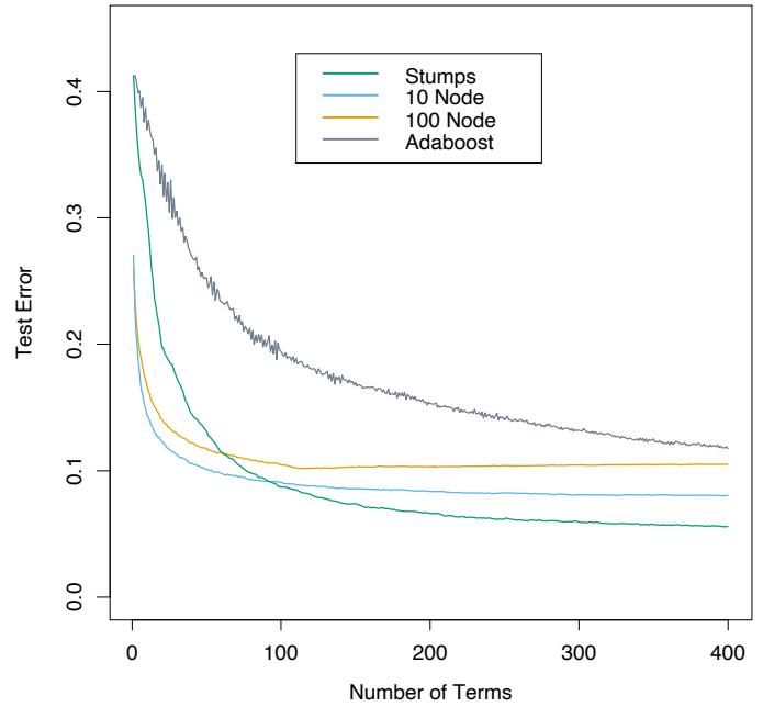 Here χ2 10(0.5) = 9.34 is the median of a chi-squared random variable with 10 degrees of freedom (sum of squares of 10 standard Gaussians). There are 2000 training cases, with approximately 1000 cases in each class, and 10,000 test observations. Here the weak classifier is just a “stump”: a two terminalnode classification tree. Applying this classifier alone to the training data set yields a very poor test set error rate of 45.8%, compared to 50% for