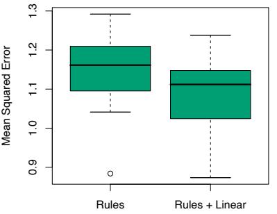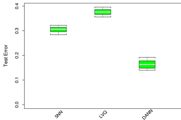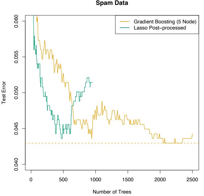 random guessing. However, as boosting iterations proceed the error rate steadily decreases, reaching 5.8% after 400 iterations. Thus, boosting this simple very weak classifier reduces its prediction error rate by almost a factor of four. It also outperforms a single large classification tree (error rate 24.7%). Since its introduction, much has been written to explain the success of AdaBoost in producing accurate classifiers. Most of this work has centered on using classification trees as the “base learner” G(x), where improvements are often most dramatic. In fact, Breiman (NIPS Workshop, 1996) referred to AdaBoost with trees as the “best off-the-shelf classifier in the world” (see also Breiman (1998)). This is especially the case for datamining applications, as discussed more fully in Section 10.7 later in this chapter.