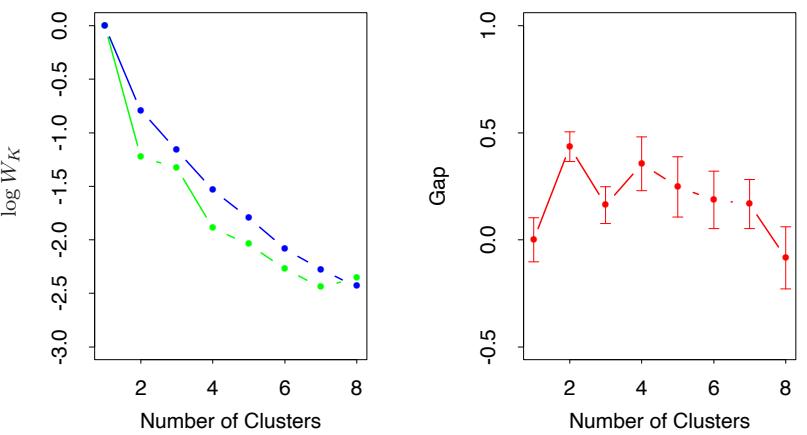The advantage of the SAM approach lies in the possible asymmetry of the cutpoints. In the example of Figure 18.20, with ∆ = 0.71 we obtain 11 significant genes; they are all in the upper right. The data points in the bottom left never leave the band, and hence Clow = −∞. Hence for this value of ∆, no genes are called significant on the left (negative) side. We do not impose symmetry on the cutpoints, as was done in Section 18.7.1, as there is no reason to assume similar behavior at the two ends.