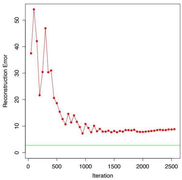 FIGURE 10.3. Simulated data, boosting with stumps: misclassification error rate on the training set, and average exponential loss: (1/N) PN i=1 exp(−yif(xi)). After about 250 iterations, the misclassification error is zero, while the exponential loss continues to decrease.