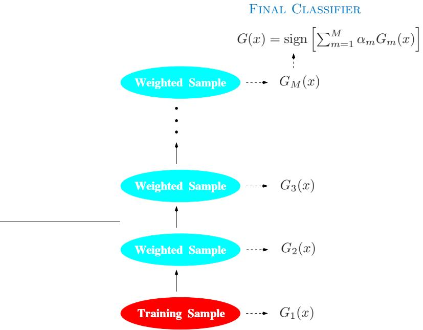 FIGURE 10.1. Schematic of AdaBoost. Classifiers are trained on weighted versions of the dataset, and then combined to produce a final prediction.