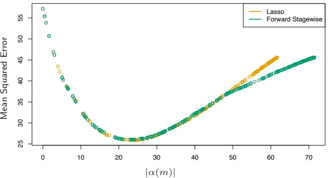 Forward stagewise modeling approximates the solution to (10.4) by sequentially adding new basis functions to the expansion without adjusting the parameters and coefficients of those that have already been added. This is outlined in Algorithm 10.2. At each iteration m, one solves for the optimal basis function b(x; γm) and corresponding coefficient βm to add to the current expansion fm−1(x). This produces fm(x), and the process is repeated. Previously added terms are not modified.