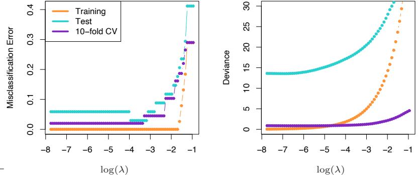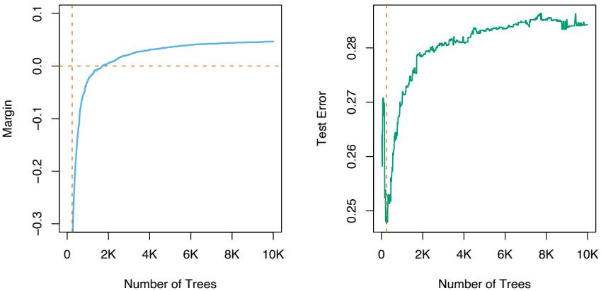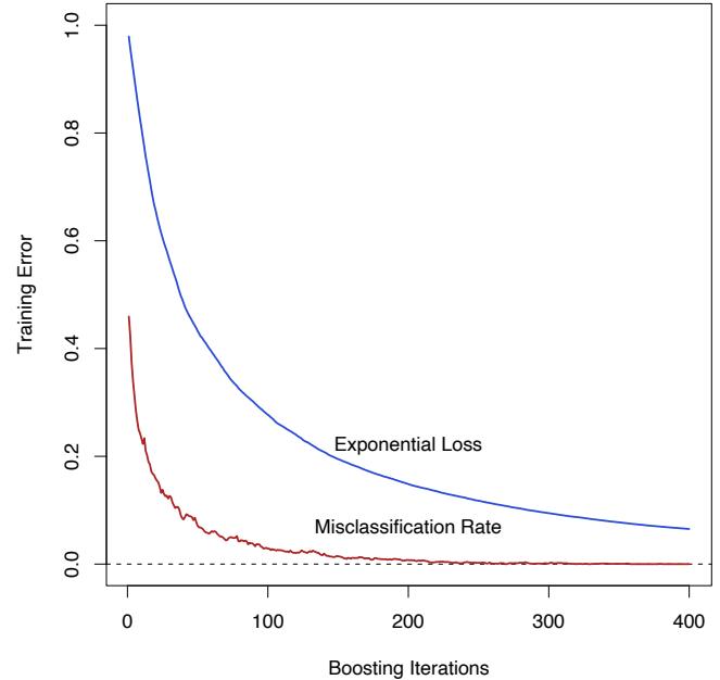 Figure 10.3 shows the training-set misclassification error rate and average exponential loss for the simulated data problem (10.2) of Figure 10.2. The training-set misclassification error decreases to zero at around 250 iterations (and remains there), but the exponential loss keeps decreasing. Notice also in Figure 10.2 that the test-set misclassification error continues to improve after iteration 250. Clearly Adaboost is not optimizing trainingset misclassification error; the exponential loss is more sensitive to changes in the estimated class probabilities.
