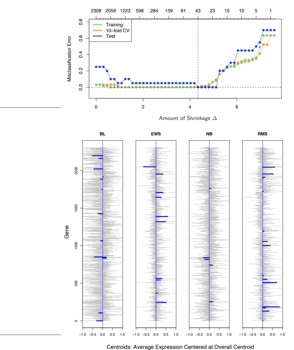 Ex. 18.2 Nearest shrunken centroids and the lasso. Consider a (naive Bayes) Gaussian model for classification in which the features j = 1, 2,…,p are assumed to be independent within each class k = 1, 2,…,K. With observations i = 1, 2,…,N and Ck equal to the set of indices of the Nk observations in class k, we observe xij ∼ N(µj + µjk, σ2 j ) for i ∈ Ck with #K k=1 µjk = 0. Set ˆσ2 j = s2 j , the pooled within-class variance for feature j, and consider the lasso-style minimization problem