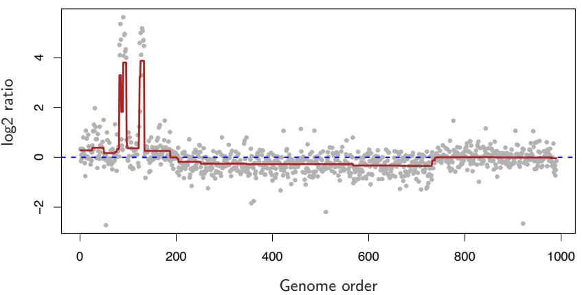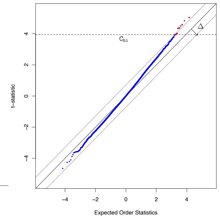Two lines are drawn, parallel to the 45◦ line, ∆ units away. Starting at the origin and moving to the right, we find the first place that the genes leave the band. This defines the upper cutpoint Chi and all genes beyond that point are called significant (marked red). Similarly we find the lower cutpoint Clow for genes in the bottom left corner. Thus each value of the tuning parameter ∆ defines upper and lower cutpoints, and the plug-in estimate FDR for each of these cutpoints is estimated as before. Typically ! a range of values of ∆ and associated FDR values are computed, from which ! a particular pair are chosen on subjective grounds.