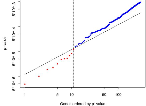 Starting at the left and moving right, the BH method finds the last time that the p-values fall below the line. This occurs at j = 11, so we reject the 11 genes with smallest p-values. Note that the cutoff occurs at the 11th smallest p-value, 0.00012, and the 11th largest of the values |tj | is 4.101 Thus we reject the 11 genes with |tj | ≥ 4.101.