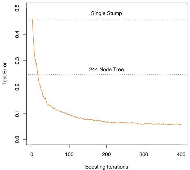 FIGURE 10.2. Simulated data (10.2): test error rate for boosting with stumps, as a function of the number of iterations. Also shown are the test error rate for a single stump, and a 244-node classification tree.