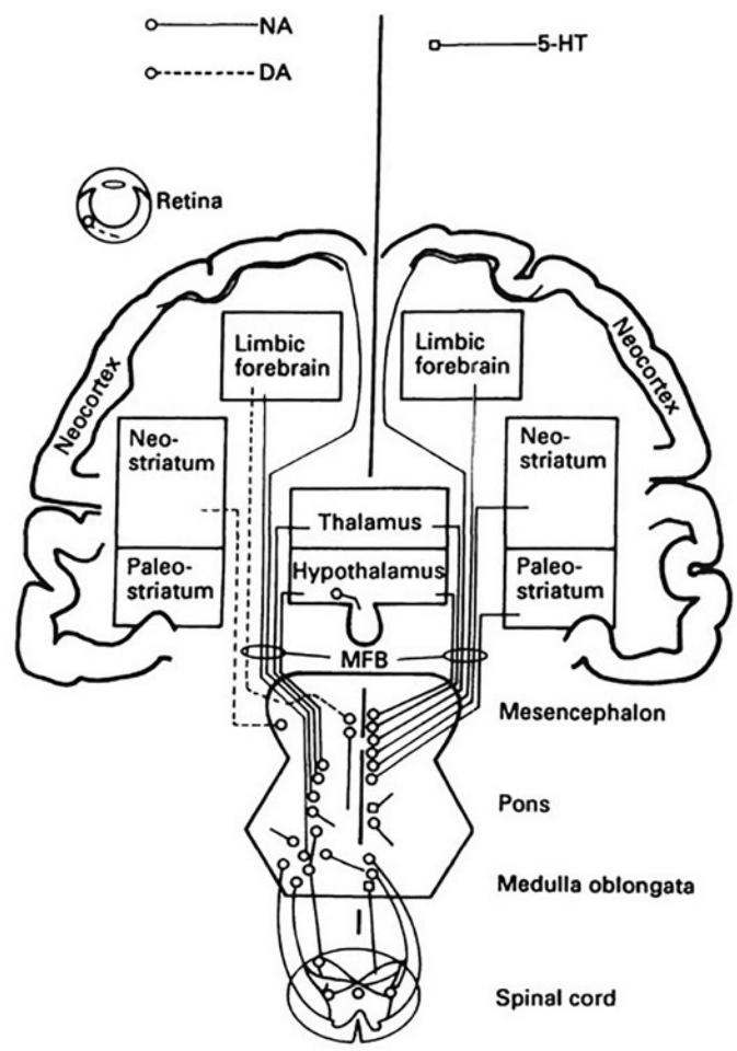 The most researched seasonally related disorder studied so far has been depression (Kripke et al. 1983a, b; Rosenthal et al. 1984; Lewy et al. 1985; Wehr et al. 1985, 1986). As these researchers suggest, many biological functions seem entrained to light/dark cyclic variation. Of special interest has been the hormone melatonin. 5-HT is a precursor of melatonin. Melatonin appears to be concentrated in the hypothalamus and midbrain and may modify neurotransmitter inputs for the hypothalamic control of various hormones (Gilmore 1981). This pineal hormone increases during dark hours and decreases during light hours. Melatonin hormone change (among other hormone changes) is believed to play a role in jet lag symptoms. There is also a seasonal variation to melatonin, being higher in winter months and lower in summer months. The pathway that is believed to operate in this mechanism is the retinohypothalmic tract. Melatonin plays an important regulatory role in oscillating mechanisms (biological clocks). Rosenthal et al.’s (1984) paper gives an excellent airing of the issues and is well referenced. Rosenthal et al. note Kraepelin’s observation that some patients exhibit clear excitement during the spring period only to lapse into depressive states during the autumn. Their own research suggests that “a few single women reported inability to keep a boyfriend in the winter but no diffi culty in fi nding another one during the following summer.” (p.73). Such observations might be expected if these seasonally triggered changes are co-ordinated with (primitive) reproductive social behaviours.
