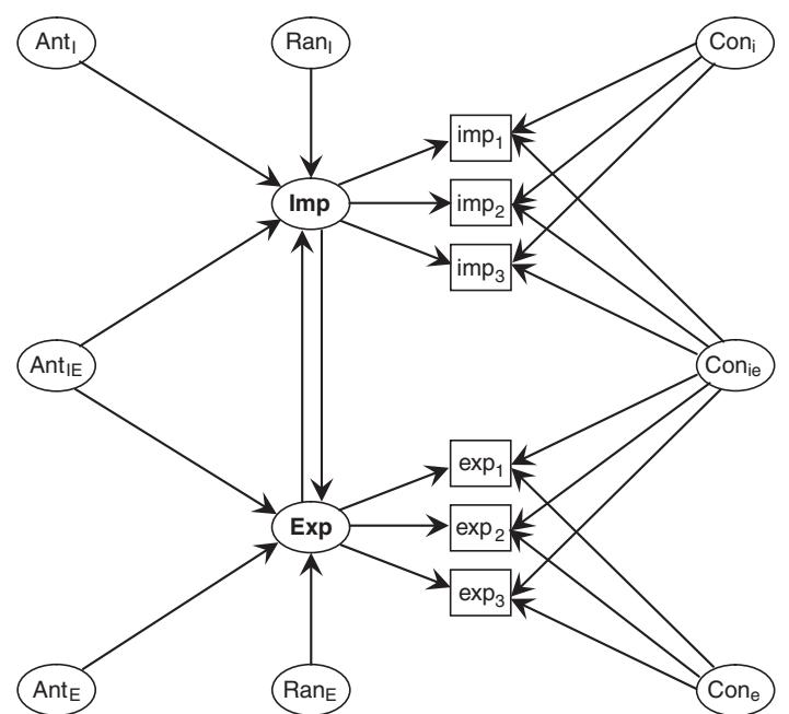 Within the social cognition literature, the model that is most similar to our general framework is that outlined by Hofmann, Gschwendner, Nosek, and Schmitt (2005). Hofmann et al. (2005) identified five classes of factors that influence the degree of consistency between implicit and explicit measures: ’‘1 translation between implicit and explicit representations, [2] additional information integration for explicit representations, [3] properties of explicit assessment, [4] properties of implicit assessment, and [5] research design factors such as sampling selectivity and measurement correspondence’’ (p. 344). Parallels between models may be identified. Translation corresponds to the paths between the latent Imp and Exp variables in our framework. Information integration is similar to reconciliation (of explicit representations of Imp with AntE) within our framework. Explicit and implicit assessment correspond to aspects of our measurement model linking latent variables (Imp and Exp) to observed indicators (each imp and exp). Finally, we have outlined several design factors, including measurement correspondence, which in our framework represents an issue of confounded measurement (Coni or Cone). Unique aspects of our framework include the formal mapping of processes onto a SEM model, a distinction between association of variables and congruence of persons, and an emphasis on processes other than translation through which congruence may emerge (e.g., common antecedents, random influences). Hofmann et al.’s model also makes a number of important contributions that deserve the attention of motive congruence researchers.