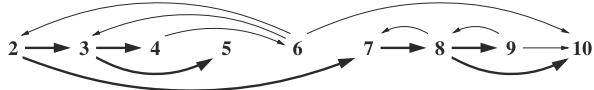 The dependencies between chapters of the book are coarsely sketched in the graph shown below. To keep it simple, Chap. 1, with the fundamental introduction for all further chapters, is left out. As an example, the thicker arrow from 2 to 3 means that propositional logic is a prerequisite for understanding predicate logic. The thin arrow from 9 to 10 means that neural networks are helpful for understanding reinforcement learning, but not absolutely necessary. Thin backward arrows should make clear that later chapters can give more depth of understanding to topics which have already been learned.
