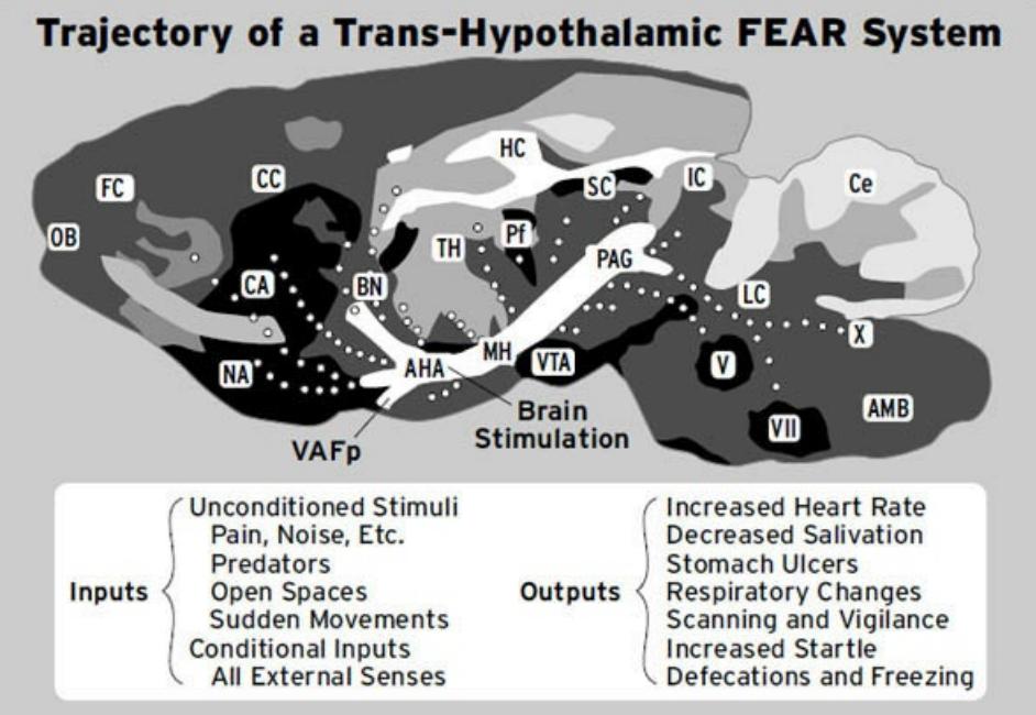 http://www.emory.edu/INTELNET/fi.hasid.html 1For instance, we have long been puzzled at the fact that very low levels of electrical stimulation of the FEAR system in the hypothalamus can promote freezing while increasing the current can provoke flight (Panksepp, Sacks et al., 1991). How can such diametrically different fear responses share a common neural substrate? One theoretical way out of this conundrum is to suppose that at the higher current levels our localized brain stimulation is spreading to the SEEKING system, which unloosens animals from immobile freezing, into the remarkable strides of flight as they “seek safety”—clearly a state that should feel more pleasant to the animal. It should be full of hope! This suggests a fascinating theoretical possibility of how the terror of FEAR may explode into the optimistic eagerness, at times almost playfulness, of flight. Unfortunately, this idea remains to be subjected to rigorous neuroscientific evaluation, so it should not be seen as a conclusion but only as a working hypothesis for further research.