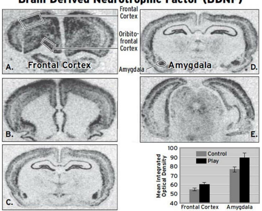 Although the intensities and time patterns of the emotional effects of cortisol can vary dramatically from one person to another, all visceral organs and many areas of the brain, as well as the immune system, can be adversely affected by a prolonged excess of cortisol. Many resulting stress-induced cascades in the brain and body can contribute to these adverse effects as well. Prolonged high cortisol levels are common in a number of psychiatric syndromes, most especially in depression. It is not known exactly how excessive secretion of cortisol can promote clinical depression. However, disruptions in the normal production of a variety of growth factors, such as BDNF (Brain-Derived Neurotrophic Factor) have been implicated. Play tends to promote positive affect partly through such chemistries (see Chapter 10), providing evidence for the common-sense principle that positive and negative feelings counteract each other in the affective economy of the mind.