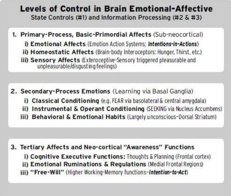 This book should be of special interest to psychiatrists and other mental health professionals as well as students of the affective, behavioral, and cognitive neurosciences (each of which takes a rather different approach to the study and discussion of emotions). Our focus here will be on the primary-process nature of these systems, but we will not neglect the levels that most other investigators are studying—the secondary process (inbuilt emotional learning mechanisms) and the tertiary process (emotional thoughts and deliberations that are so evident in human experience).