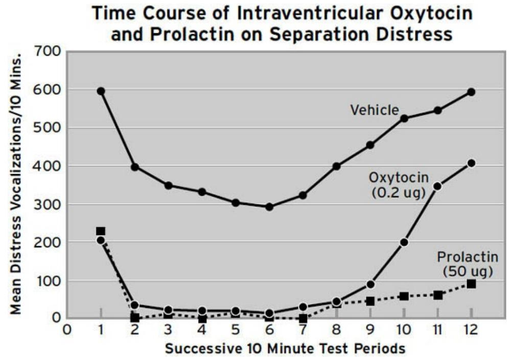 We mentioned earlier that ewes have a very short bonding window, lasting no more than a few hours. If the mother does not have access to her lamb during this window of time, social memory pathways that promote maternal attractions will not form in her olfactory bulb and she will have no enticing imprint of her lamb’s smell. However, researchers have found that the bonding window can be artificially re-opened for a couple of hours if the ewe is provided with stimulation to the vagina and cervix (Keverne et al., 1983; Kendrick et al., 1992) via a procedure straightforwardly referred to as vagino-cervical stimulation (VCS). VCS produces a number of responses in the ewe’s central nervous system, one of which is a surge of oxytocin release (Levy et al., 1995). Because the normal mammalian birthing process stimulates the ewe’s vagina and cervix, it seems likely that the oxytocin released by VCS helps generate a new ~2-hour social bonding window where the smell of a young animal becomes attractive again. In a finding that demonstrates a similar attachment response in infants, it has been shown in rats that administration of oxytocin into young rat pups can make the mother-associated odors more attractive (Nelson & Panksepp, 1996).