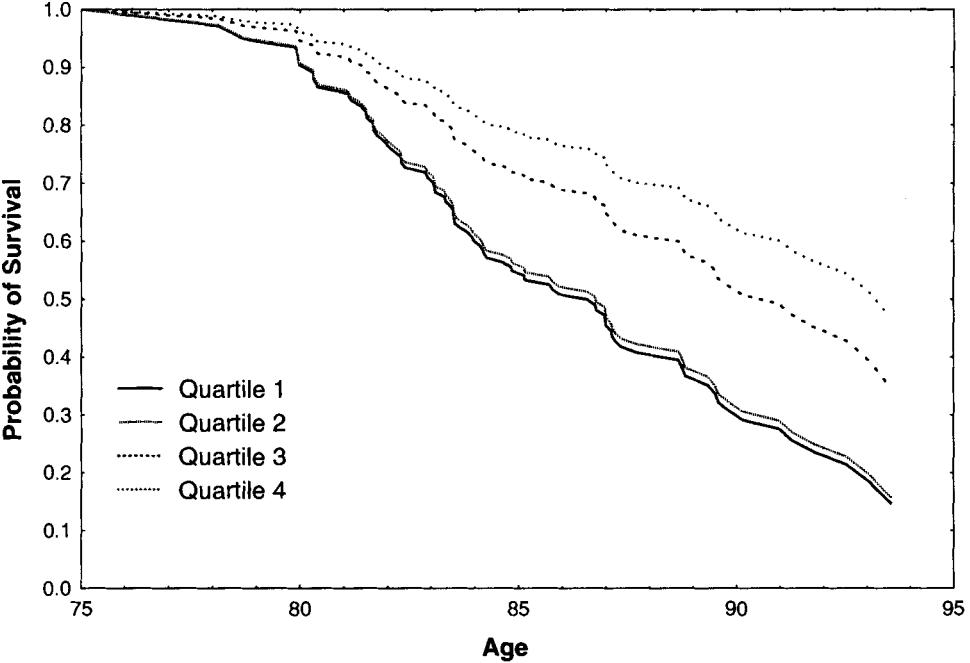 Figure 1. Quartile rankings of the number of positive emotion sentences in autobiographies written in early life and the probability of survival in late life for 180 participants in the Nun Study. (Note that the survival curves for Quartiles 1 and 2 are virtually overlaid on each other.)