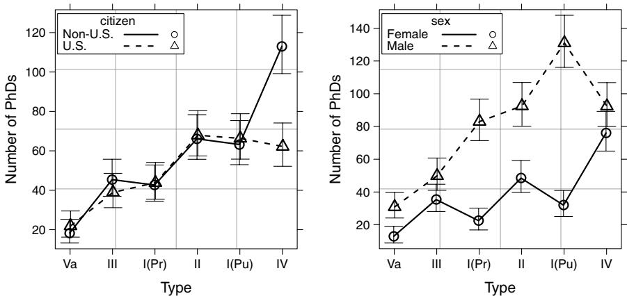 The effects plot is shown in Figure 12.3. The model returns fitted values in the logit scale, and these were transformed first to fitted odds by