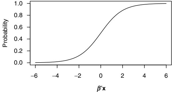 The quantity β′x is called the linear predictor. As in nonlinear models, the function m is called a kernel mean function. Because the left side of (12.6) is a probability, m(β′x) must map β′x, which can take any possible value in (−∞, ∞), into the range (0, 1). The most frequently used kernel mean function for binomial regression, and the only one we discuss in this book, is the logistic function,