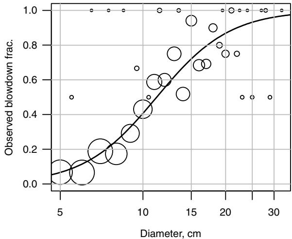 Figure 12.2 Plot of the the blowdown fraction versus d, with the horizontal axis in log scale. The plotted points have area proportional to the sample size for that point. The solid line is the fitted logistic regression.