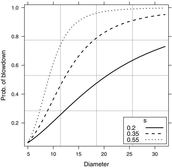 exponentiating, and then to the fitted probabilities shown on the plot. The horizontal axis is the diameter d. Because of the interaction, the dependence of the probability of blowdown on d will be different for each value of s. Three curves are shown in Figure 12.3, corresponding roughly to the 25%, 50%, and 75% points of the distribution of s for the black spruce trees. The effect of d increases fastest for the highest quartile and slowest for the lowest quartile. This plot could be drawn with many variations, including using log(d) on the horizontal axis, using odds or log-odds on the vertical axis, and reversing the roles of d and s in the plot, but the presentation here seems to catch the essence of the solution.