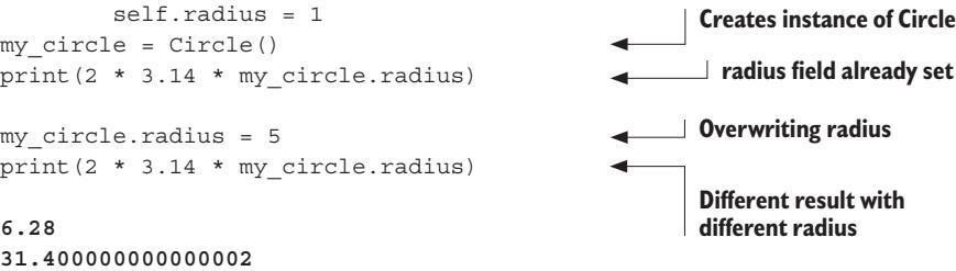 By convention, self is always the name of the first argument of __init__. self is set to the newly created circle instance when __init__ is run. Next, the code uses the class definition. You first create a Circle instance object. The next line makes use of the fact that the radius field is already initialized. You can also overwrite the radius field; as a result, the last line prints a different result from the previous print statement.