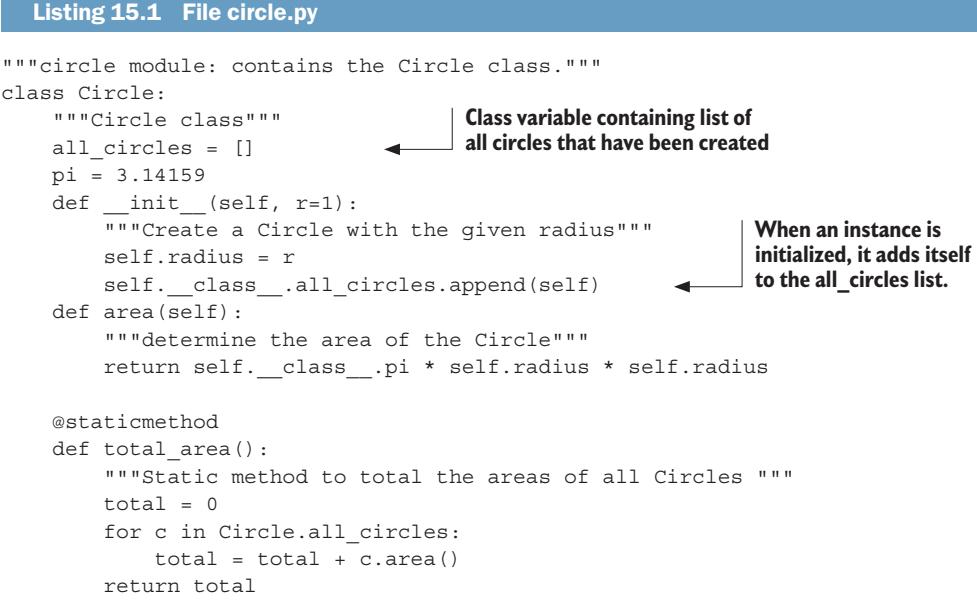 This example is exactly how you’d expect a class variable to act; it’s associated with and contained in the class that defines it. Notice in this example that you’re accessing Circle.pi before any circle instances have been created. Obviously, Circle.pi exists independently of any specific instances of the Circle class.