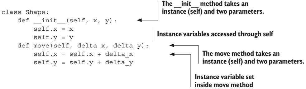 Note the two uses of radius here. self.radius is the instance variable called radius; radius by itself is the local function parameter called radius. The two aren’t the same! In practice, you’d probably call the local function parameter something like r or rad to avoid any possibility of confusion.