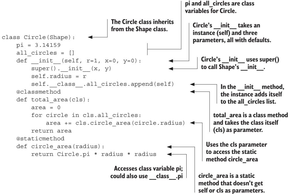 You can also access a class variable from a method of a class, through the class name. You do so in the definition of Circle.area, where the area function makes specific reference to Circle.pi. In operation, this has the desired effect; the correct value for pi is obtained from the class and used in the calculation: