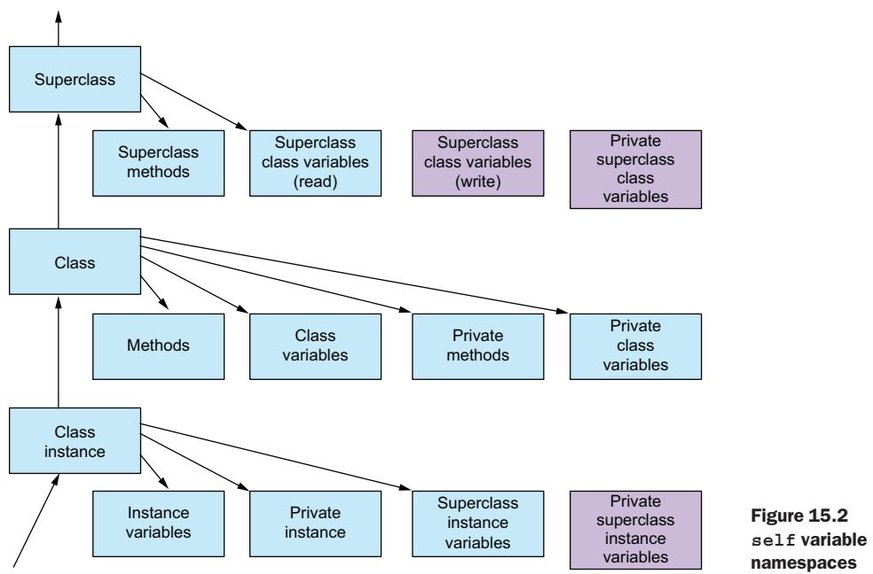 - Look for the method name in the instance namespace. If a method has been changed or added for this instance, it’s invoked in preference over methods in the class or superclass. This lookup is the same sort of lookup discussed in section 15.4.1 later in this chapter.