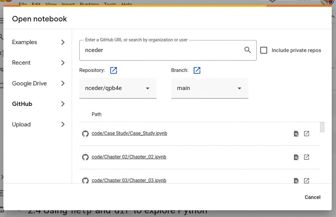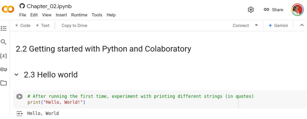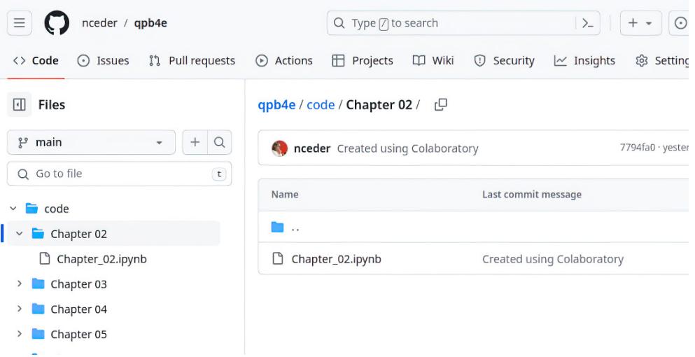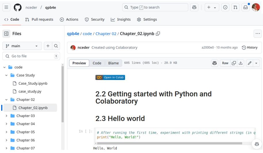 - Chapter 2 covers how to use Python via Google’s Colaboratory and how to obtain the source code as Jupyter notebooks from the book’s GitHub repository.