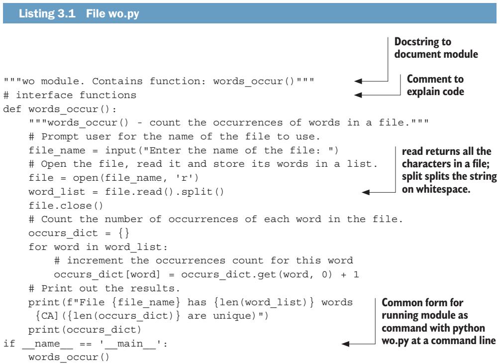 It’s easy to create your own modules, which can be imported and used in the same way as Python’s built-in library modules. The example in the following listing is a deliberately oversimplified module with one function that prompts the user to enter a filename and determines the number of times that words occur in this file.