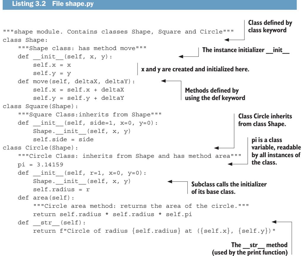 Python provides full support for object-oriented programming (OOP). Listing 3.2 is an example that might be the start of a simple shapes module for a drawing program. It’s intended mainly to serve as a reference if you’re already familiar with OOP. The callout notes relate Python’s syntax and semantics to the standard features found in other languages.