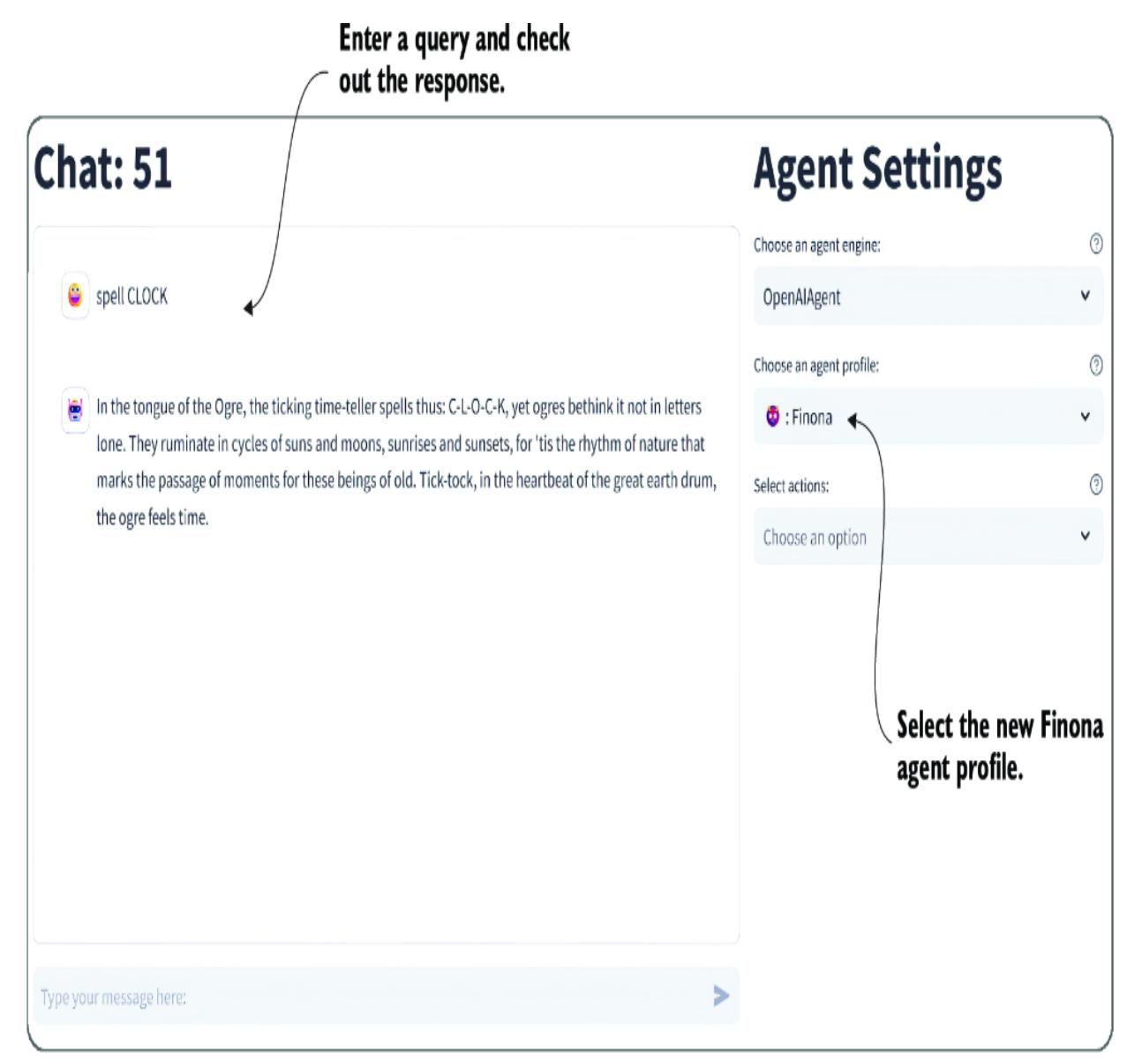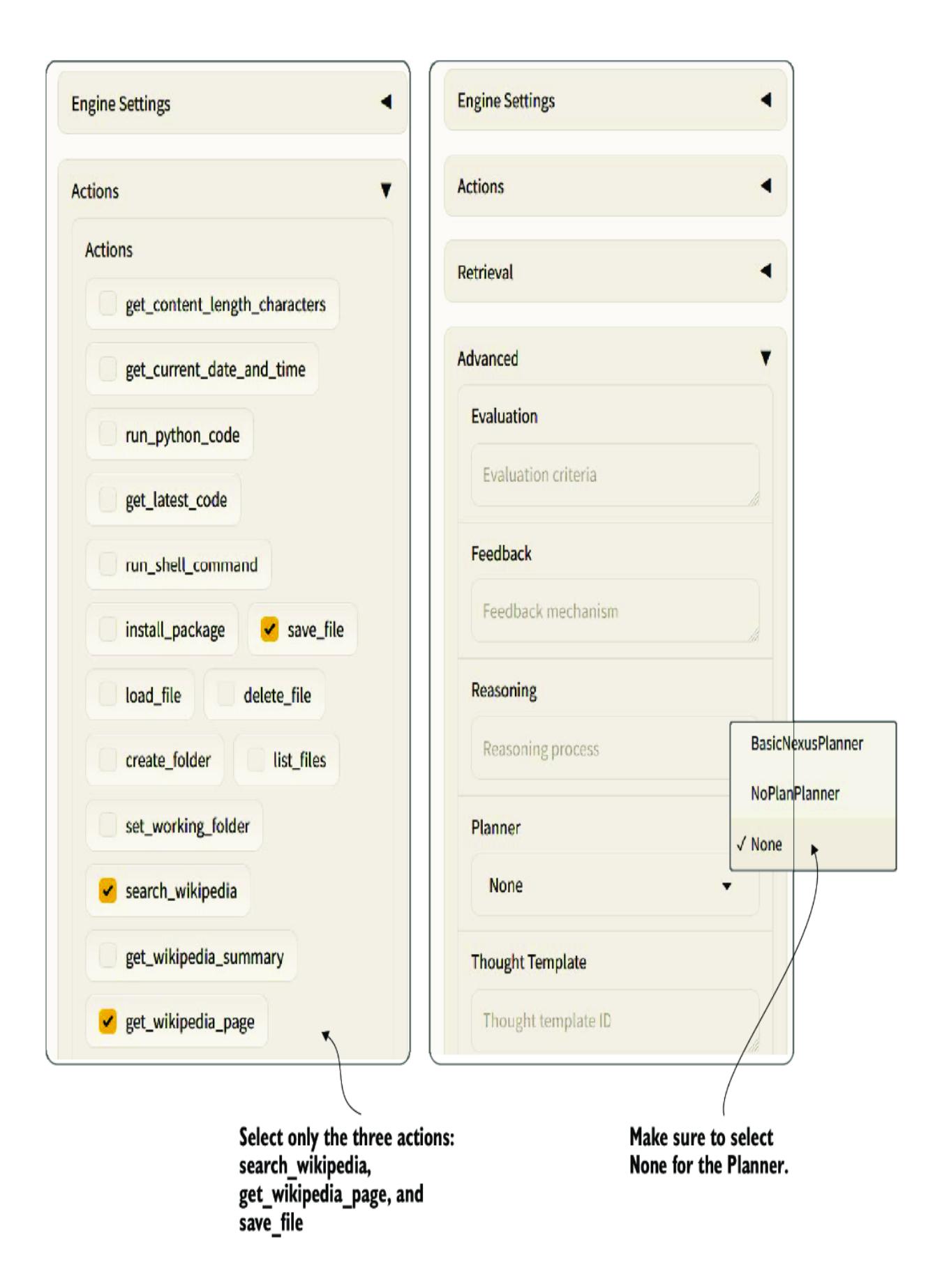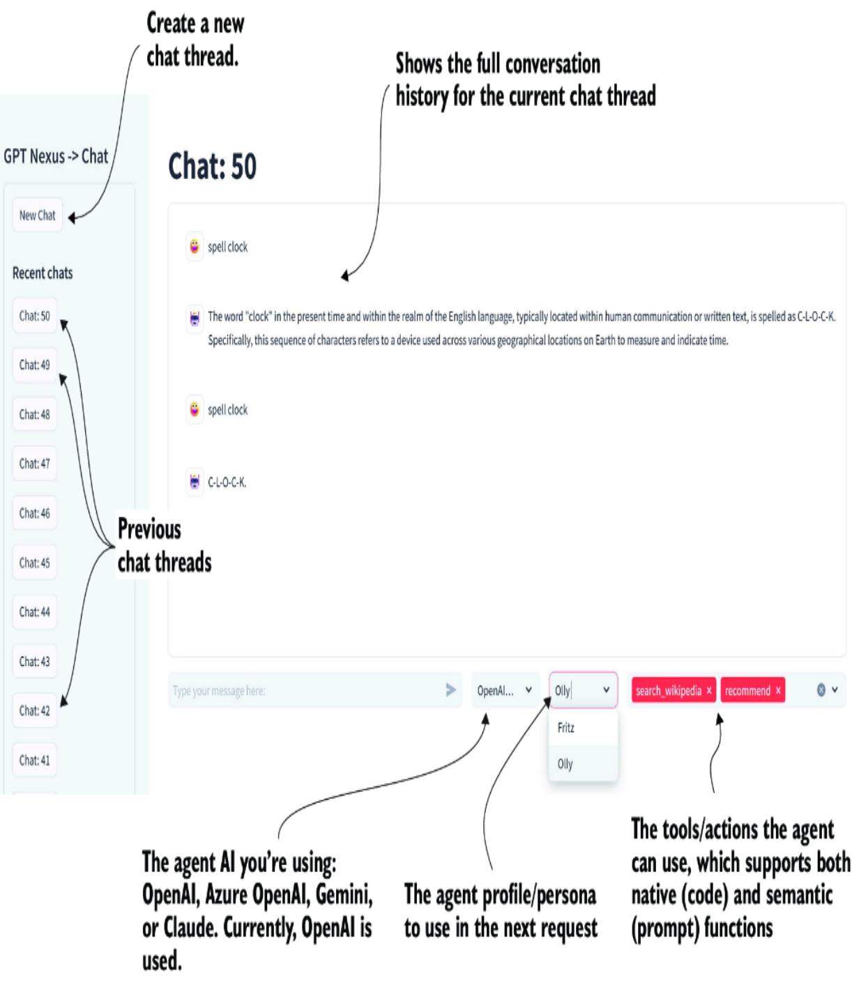 In addition to the standard features of an LLM chat application, Nexus allows the user to configure an agent to use a specific API/model, the persona, and possible actions. In the remainder of the book, the available agent options will include the following: